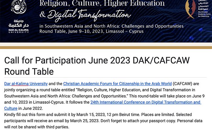 Dar al-Kalima University and the Christian Academic Forum for Citizenship in the Arab World (CAFCAW) are jointly organizing a round table entitled “Religion, Culture, Higher Education, and Digital Transformation in Southwestern Asia and North Africa: Challenges and Opportunities.” This round-table will take place on June 9 and 10, 2023 in Limassol-Cyprus. It follows the 24th International Conference on Digital Transformation and Culture in June 2022.